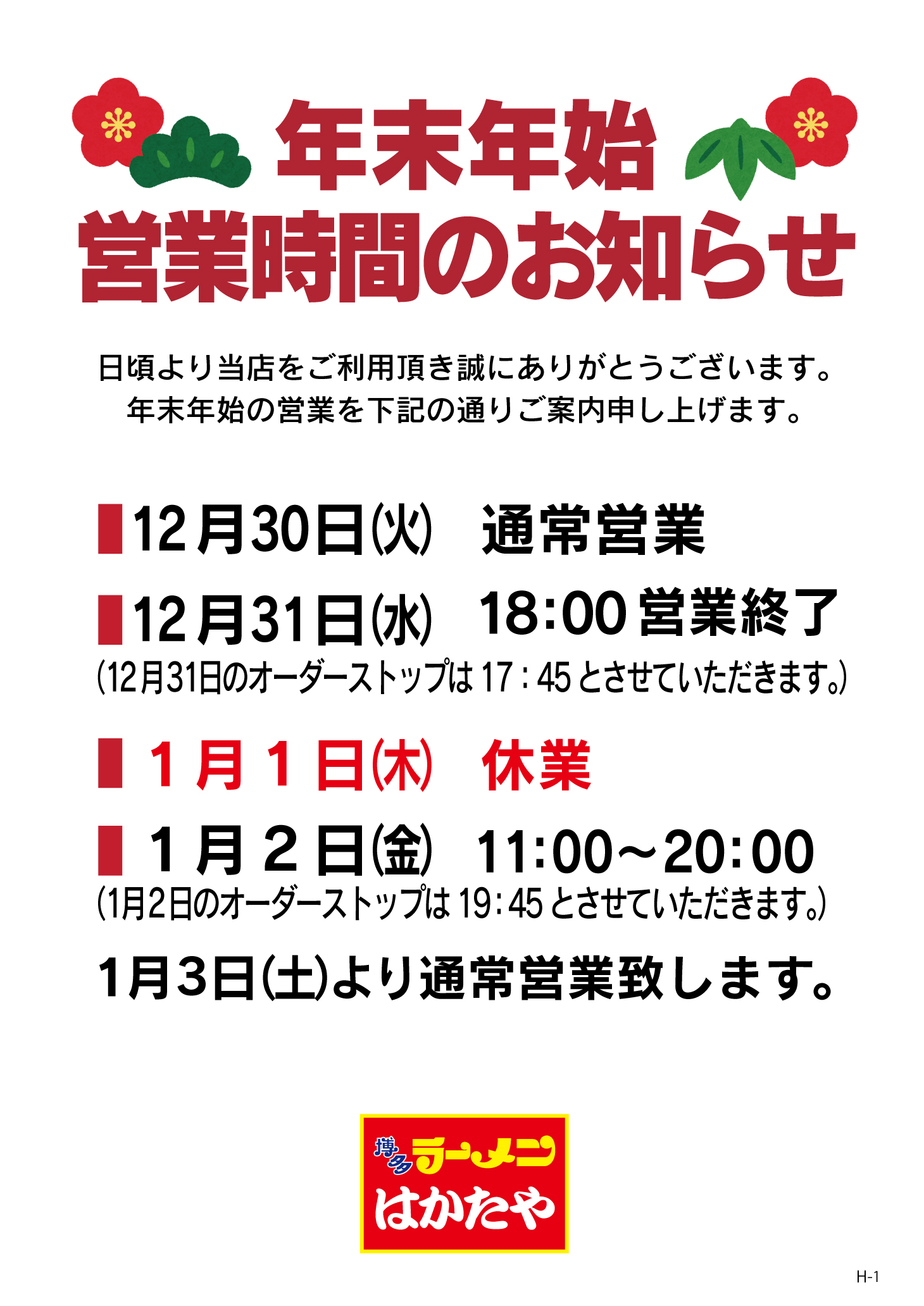 年末年始の営業時間のお知らせ